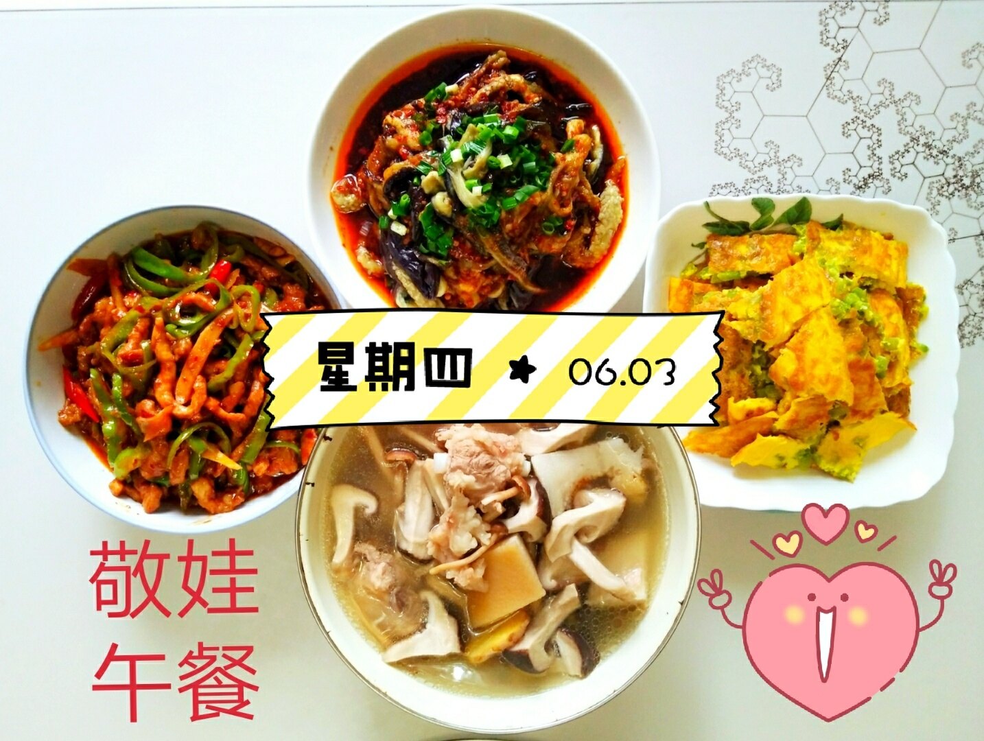 苦瓜犒鸡蛋、葱油凉拌茄子、青椒肉丝、排骨炖菇汤。巴适