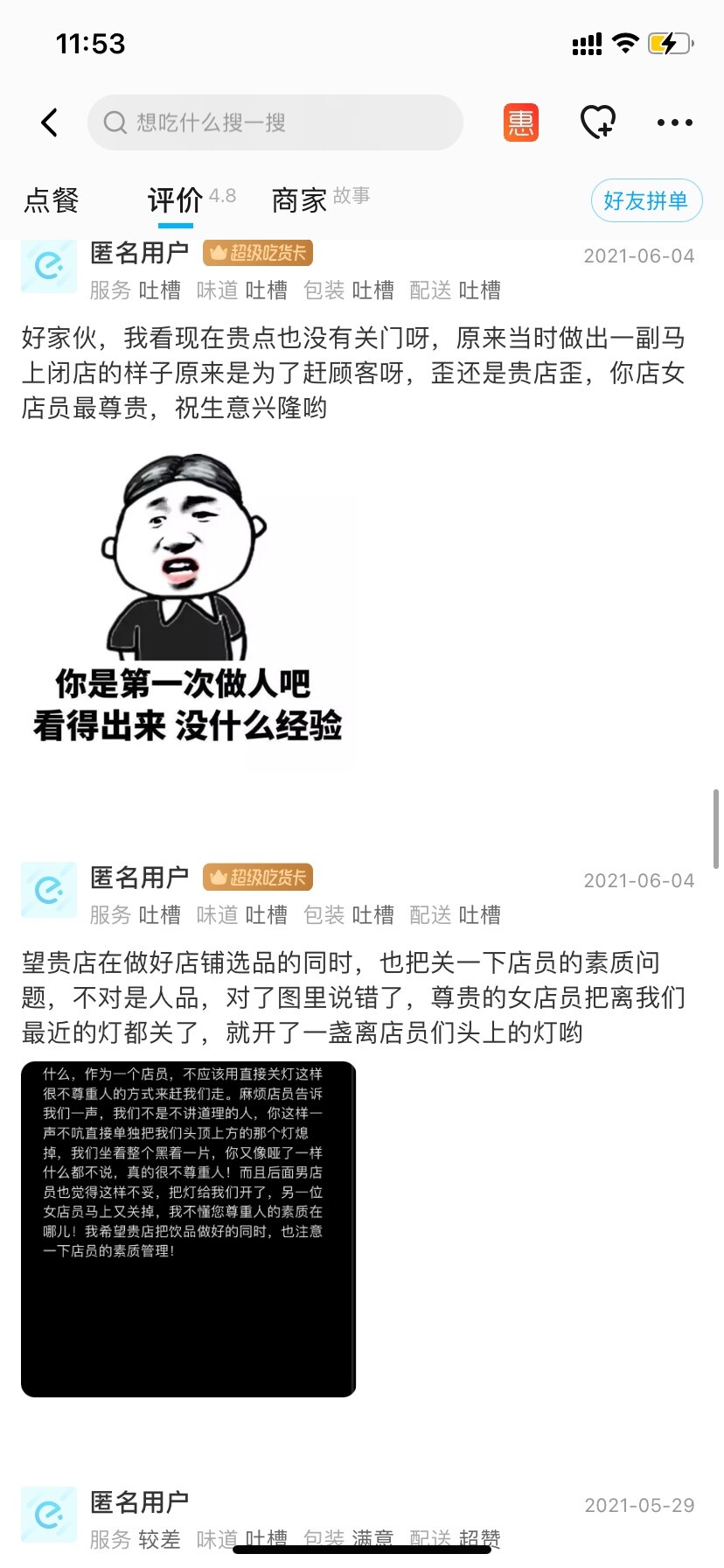 这是我们当时写的评论,然后马上被删?所以只有说老板拽不会被删,评价真实的消费体验就不行了?