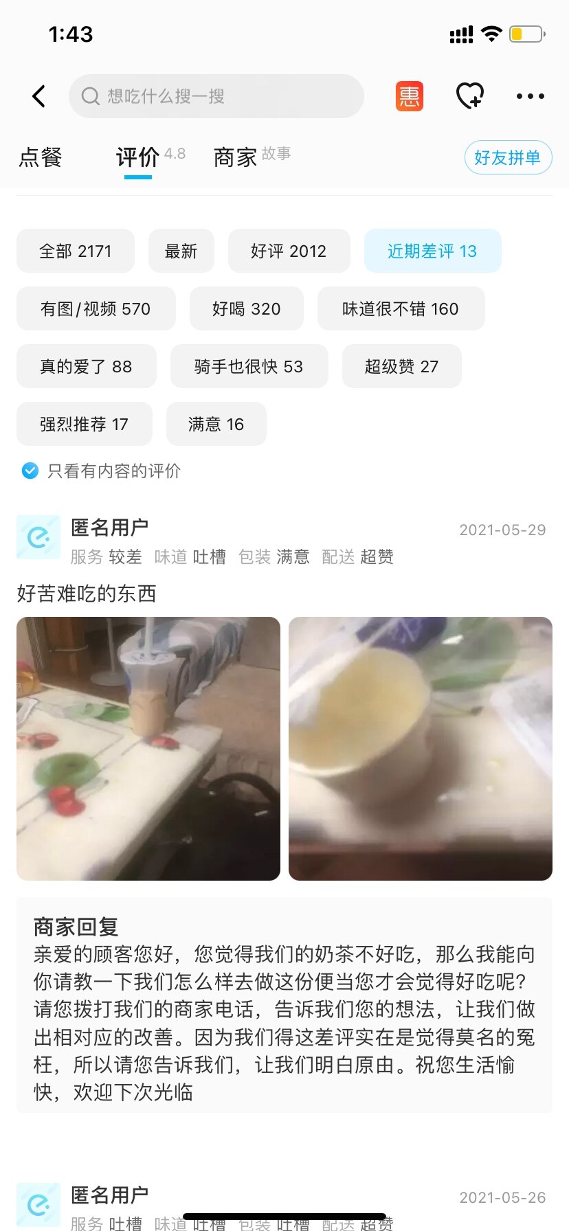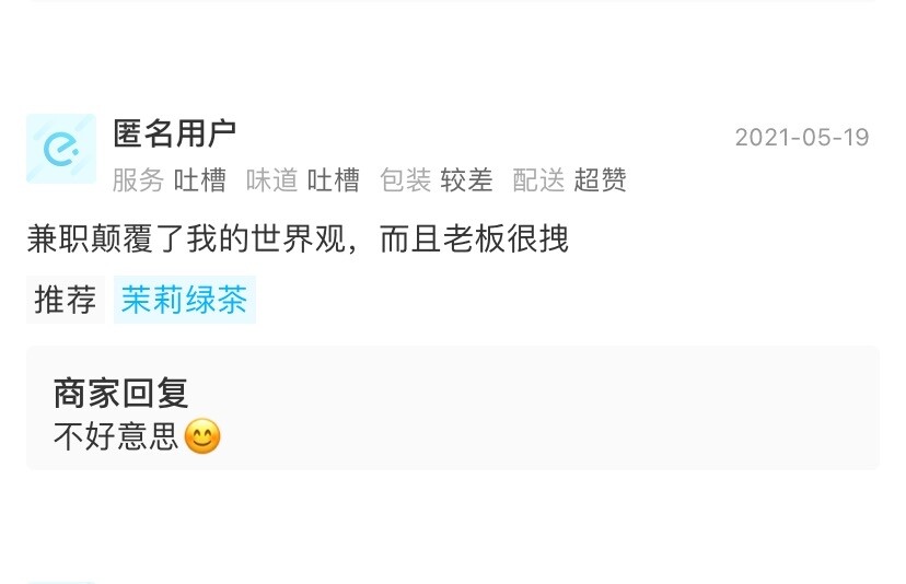 有的人记性硬是不好,既然前几次消费不满意,吃一堑长一智迈,也该吸取教训换一家噻!店家都建议她去照顾红星万达店,她说还更难喝,书亦也不行,既然都不行,不喝要得不嘛?