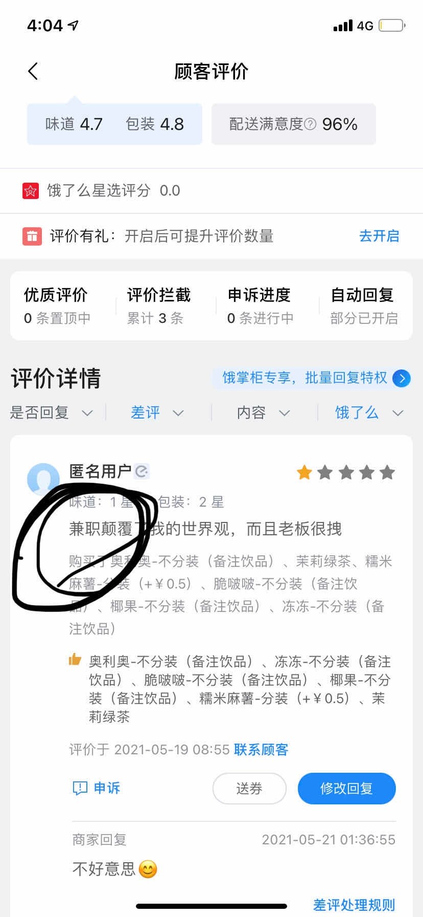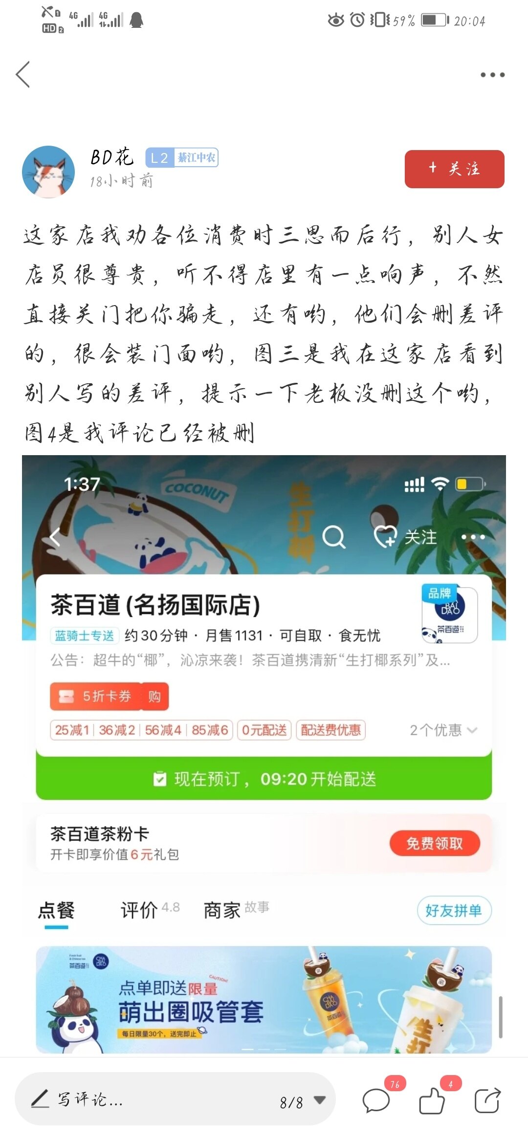 差评这个东西,店家是删不了的 做过外卖的都应该知道,安静的当吃瓜观众,别喷我