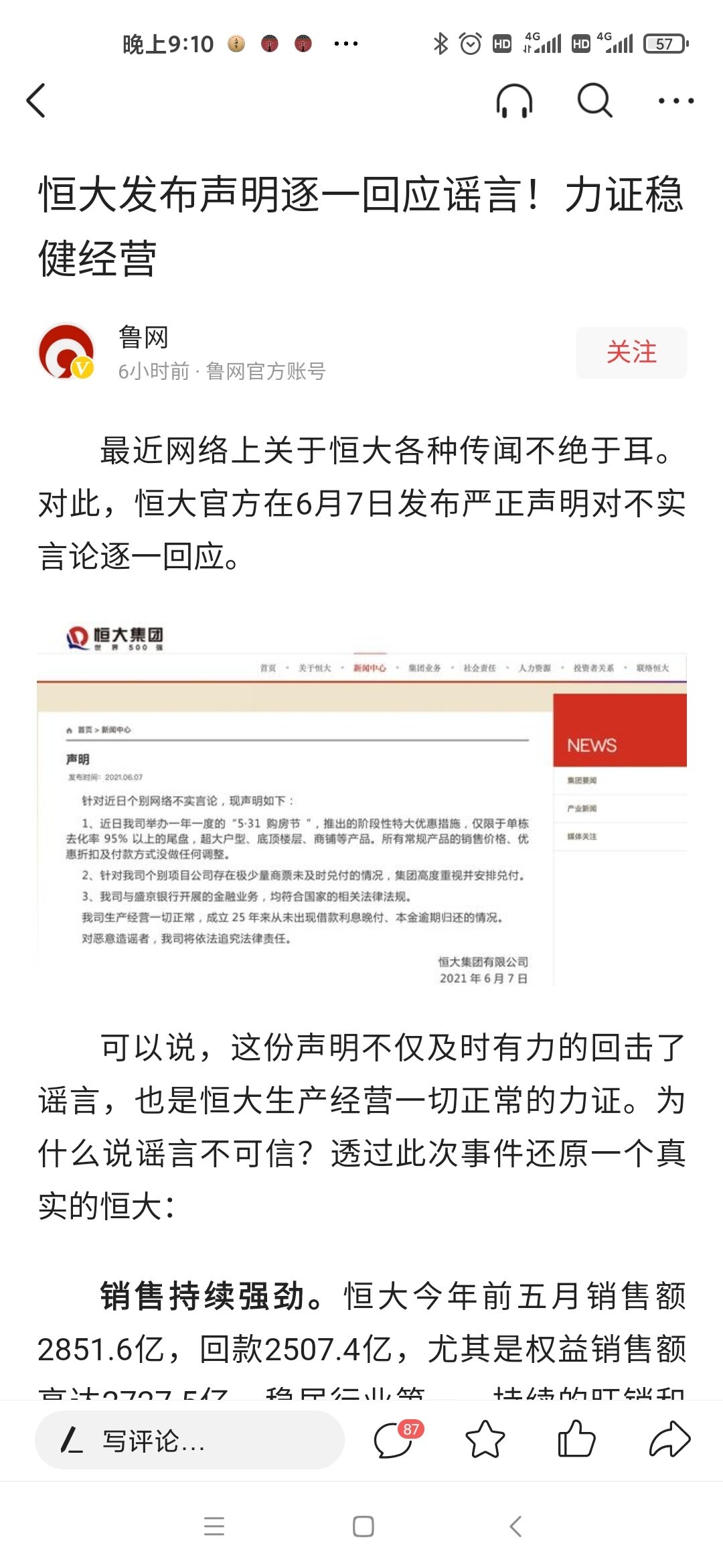 恒大发布声明,回应谣言