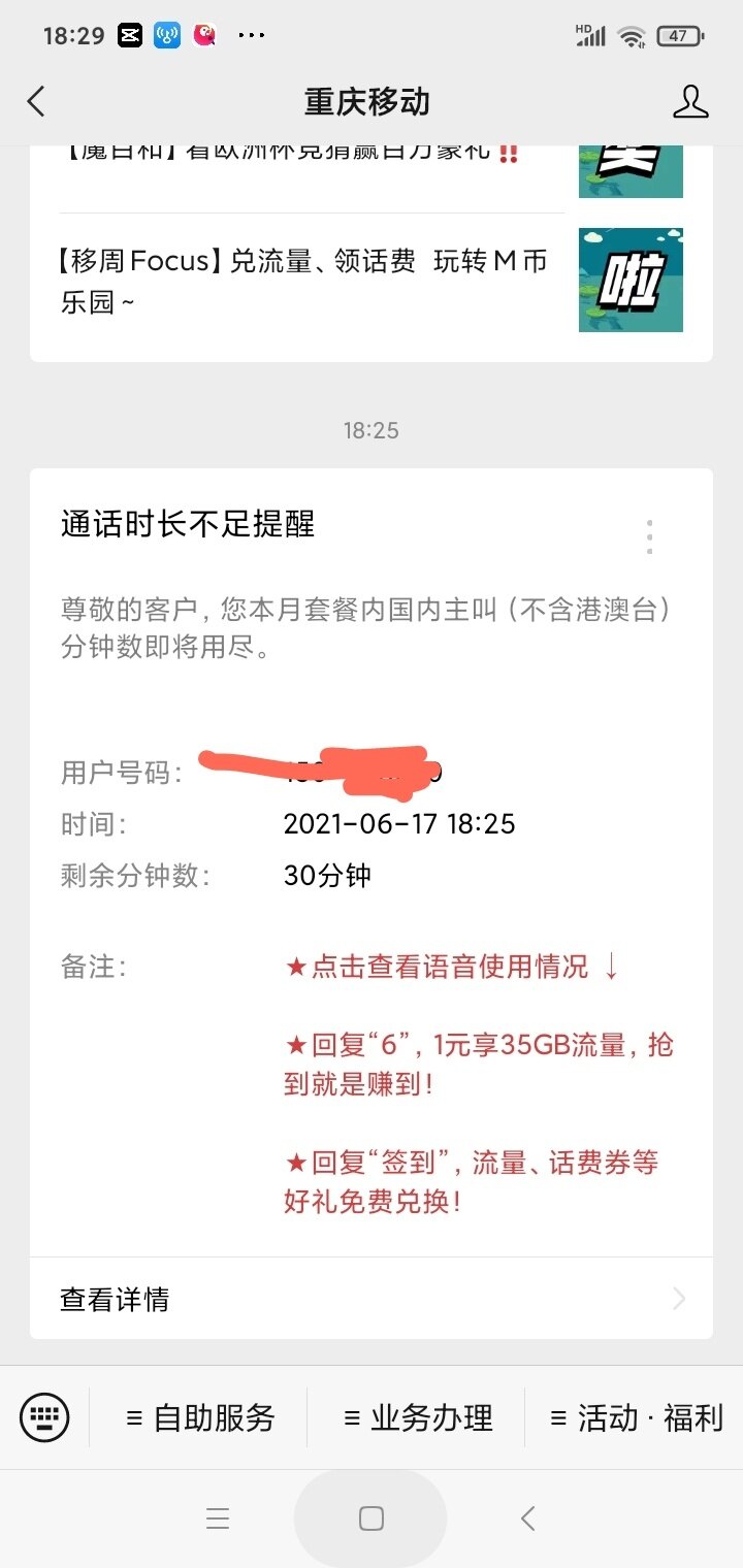 于是我就登陆微信重庆移动APP一查还真的没有多少分钟了。我就纳闷了,原来的分钟数重来就没有这么说过是咋回事。