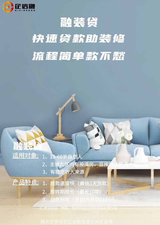 贷款装修就用装修贷,利息低至3.3厘,可做5-10年期。贷10万月供仅需1165元,让您还款轻松无压力(无需真实装修)。详情咨询:15683324301