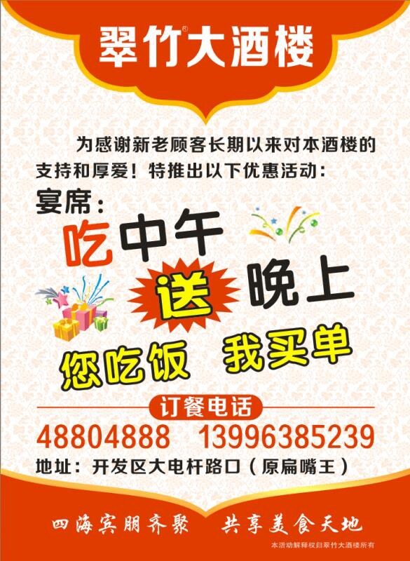 翠竹大酒楼于2014年11月16日开业、距今6年多(2400多天)、为回馈新老顾客特推出吃中午宴席,送晚上。宴席498起!!!