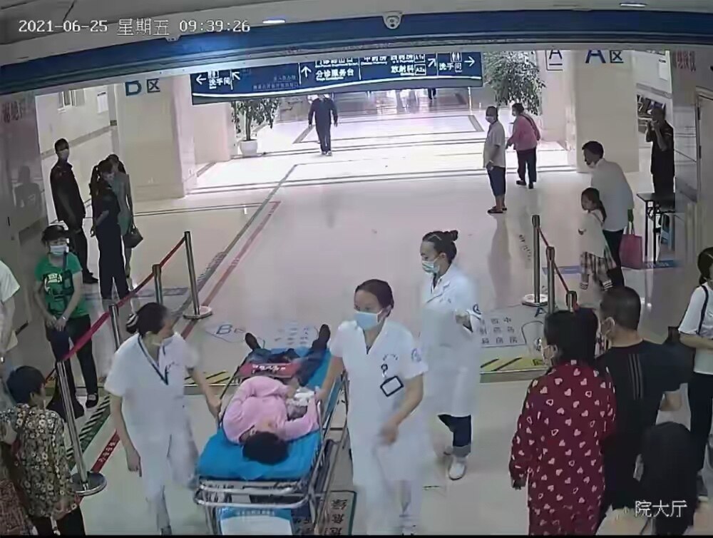 见状,鹿安琴大声呼喊咨询台的护士李冰,让其到二楼呼叫助产士蔡现宇,并让一旁的群众帮忙按住电梯,叫上护士翁继前去按住急救电梯,自己去推推床。李冰与助产士蔡现宇一边通知产科做好准备,一边极速赶到现场配合鹿安琴一起将产妇扶上推车,紧急送入产房。经过产房的专业处理,目前母女平安。