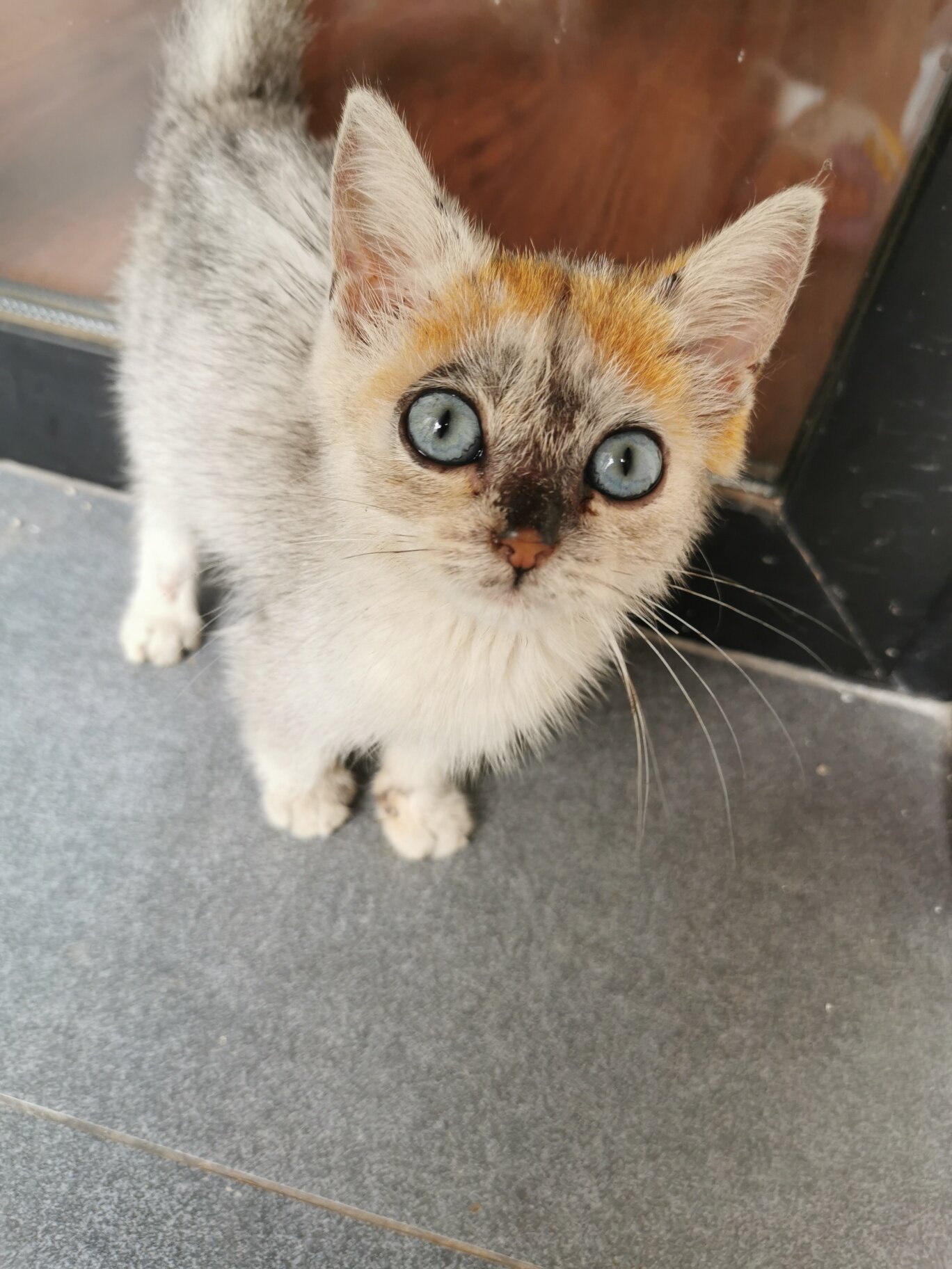 应该已经流浪了几天了,有点瘦还有点脏,脸上的黄色的东西我也不晓得是撒子,不过不是毛色…
