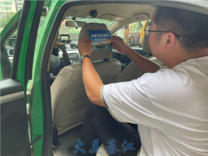 在汽车站发车处及各大公交站台可以看到,车辆车身张贴着“热烈庆祝中国共产党成立100周年”、“为中国人民谋幸福 为中华民族谋复兴”“创建全国文明城区 你我共同参与”等车身广告,车厢内部张贴庆祝中国共产党成立100周年、创建全国文明城区宣传海报,出租车内背椅插卡处放置全国文明城区创建宣传单等,宣传气息浓厚。