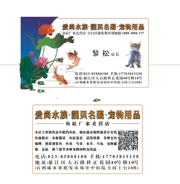 綦江区爱尚水族靓贝名猫宠物用品店主要经营:订做高中低档鱼缸海鲜池.以及各种观赏鱼冷热水鱼.各种宠物猫.猫粮狗粮.清洁鱼缸鱼池等其他业务。电微:17783815158。地址:綦江区大石路科正花园40号附10号(百利威水果批发市场往中医院方向上行20米)