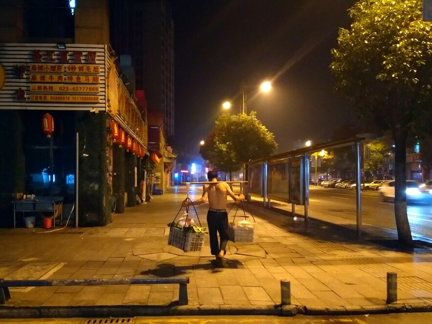 凌晨四点半钟晨跑,在沙溪河公园广场偶遇一位赤裸着上半身从万兴挑菜到回龙湾农贸市场卖菜的农民大哥。简单攀谈几句,他就急匆匆挑着担子往农贸市场赶。看着他远去的背影,心中五味杂陈……后边不远处又有一位七十来岁弓腰驼背的老大爷也在急匆匆向前赶路,手中拿着称盘。(我想是父子俩一同卖菜吧)。这张照片可以叫生命的赶路人吧!联想太多了……