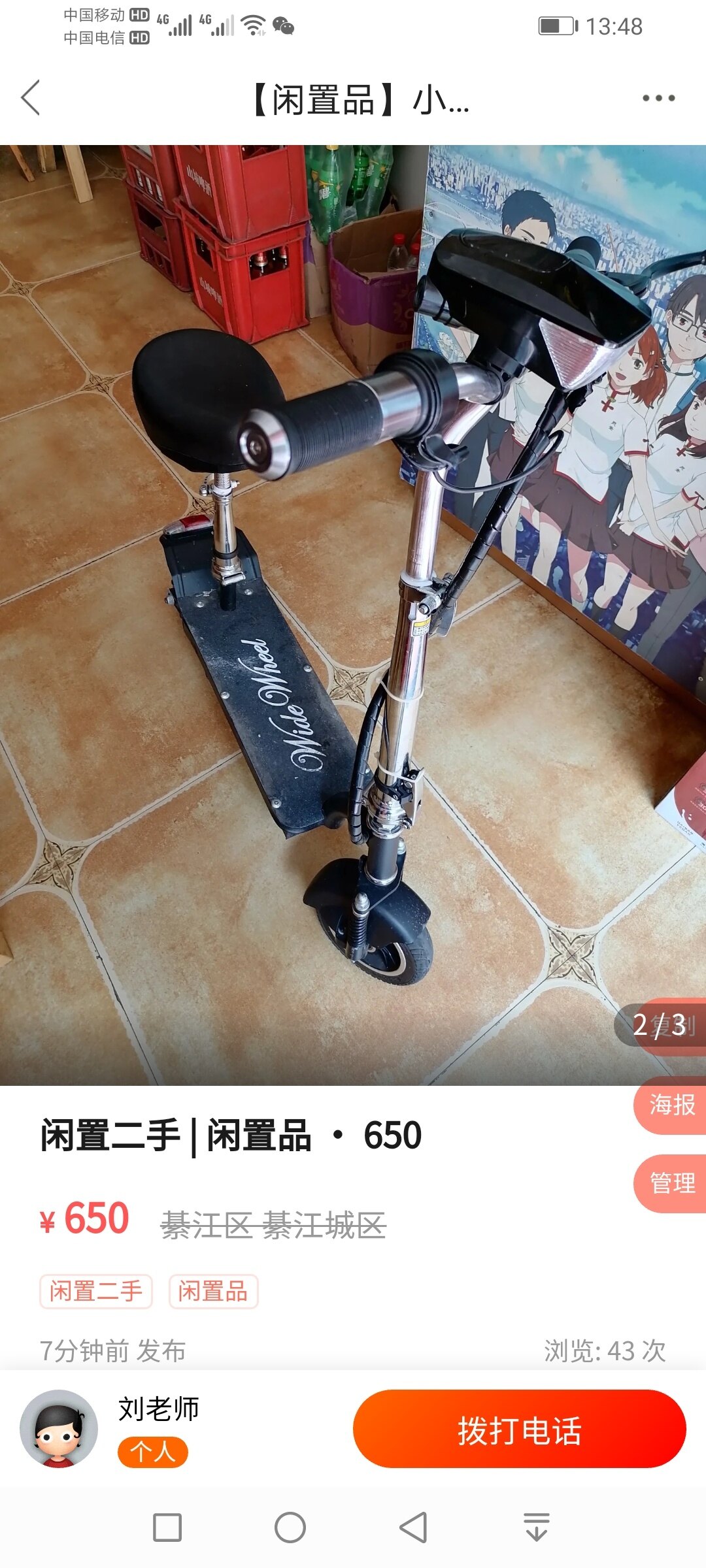 本人的一辆电动滑板车,才买个多月,36V,续航30公里,97成新,凭兴趣买的现对我适用价值不大,可折叠,代个步很适用,有需求的朋650带走,电联19923319180。