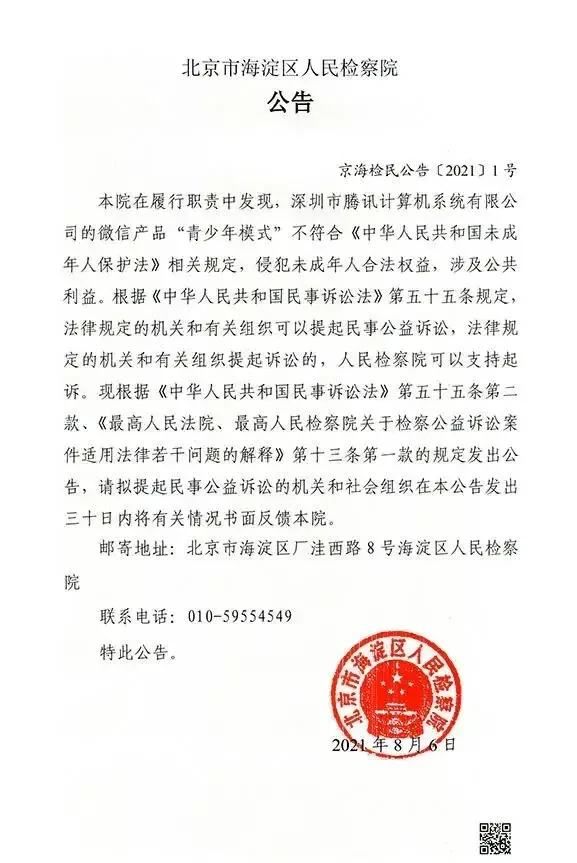 北京市海淀区厂洼西路8号海淀区人民检察院公告称,该院在履行职责中发现,深圳市腾讯计算机系统有限公司的微信产品“青少年模式”不符合《中华人民共和国未成年人保护法》相关规定,侵犯未成年人合法权益,涉及公共利益。