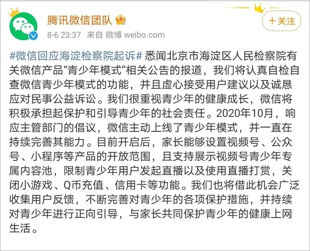 对此,@腾讯微信团队 6日晚做出回应:悉闻北京市海淀区人民检察院有关微信产品“青少年模式”相关公告的报道,我们将认真自检自查微信青少年模式的功能,并且虚心接受用户建议以及诚恳应对民事公益诉讼。我们很重视青少年的健康成长,微信将积极承担起保护和引导青少年的社会责任。