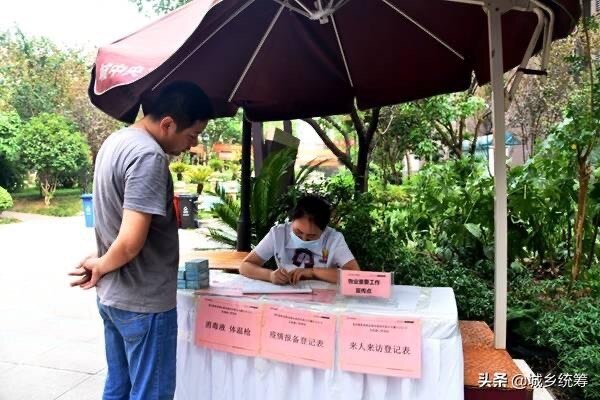 君鼎江上物业工作人员对出入小区居民进行登记