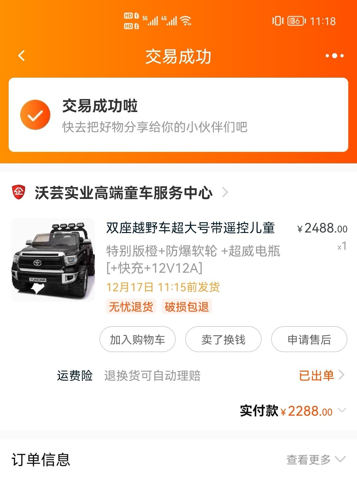 本车没开两次,由于工作原因在家时间少,所以没怎么用!此电动车可以和大人一起坐,带遥控操作,所以也是属于大型儿童车!新车实付价格2288,有意者可以商量!非诚勿扰谢谢!<br><br>