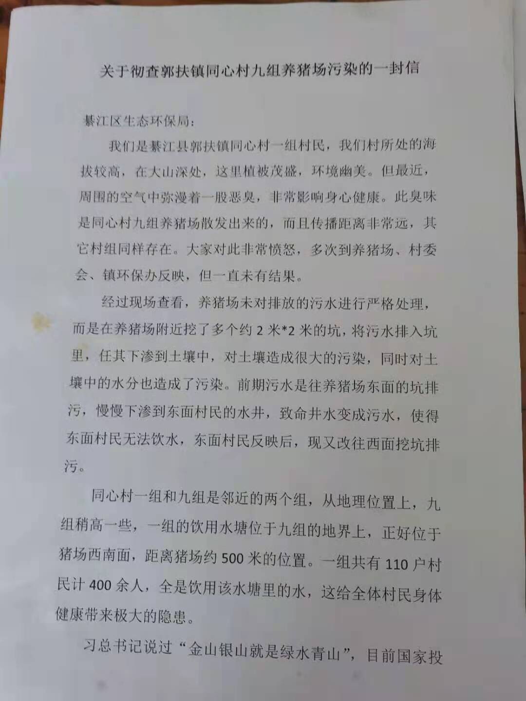 因为郭扶镇同心村九组刚组建了一个猪场导致周边村庄环境污染,水源污染严重,希望有关部门尽快解决,