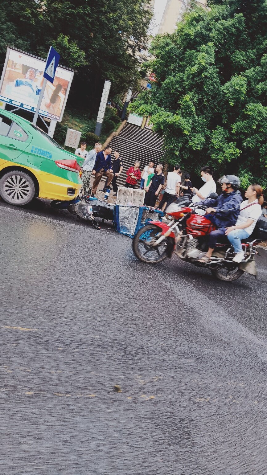 感觉托儿车刹了一脚,然后摩托踩急刹车摔倒滑过去了
