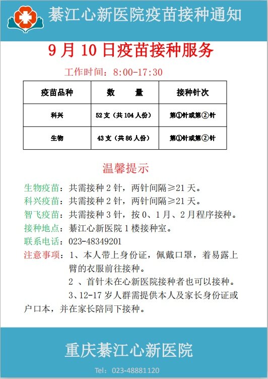 9月10日心新医院疫苗接种服务通知
