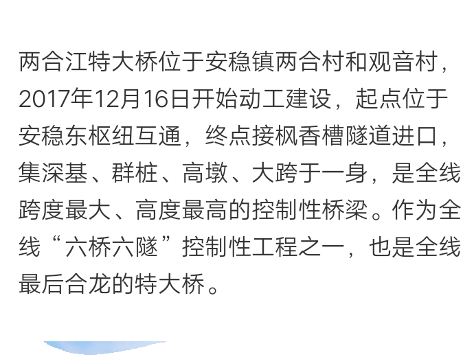 两合江特大桥位于安稳镇两合村和观音村,2017年12月16日开始动工建设,起点位于安稳东枢纽互通,终点接枫香槽隧道进口,集深基、群桩、高墩、大跨于一身,是全线跨度最大、高度最高的控制性桥梁。作为全线“六桥六隧”控制性工程之一,也是全线最后合龙的特大桥。
