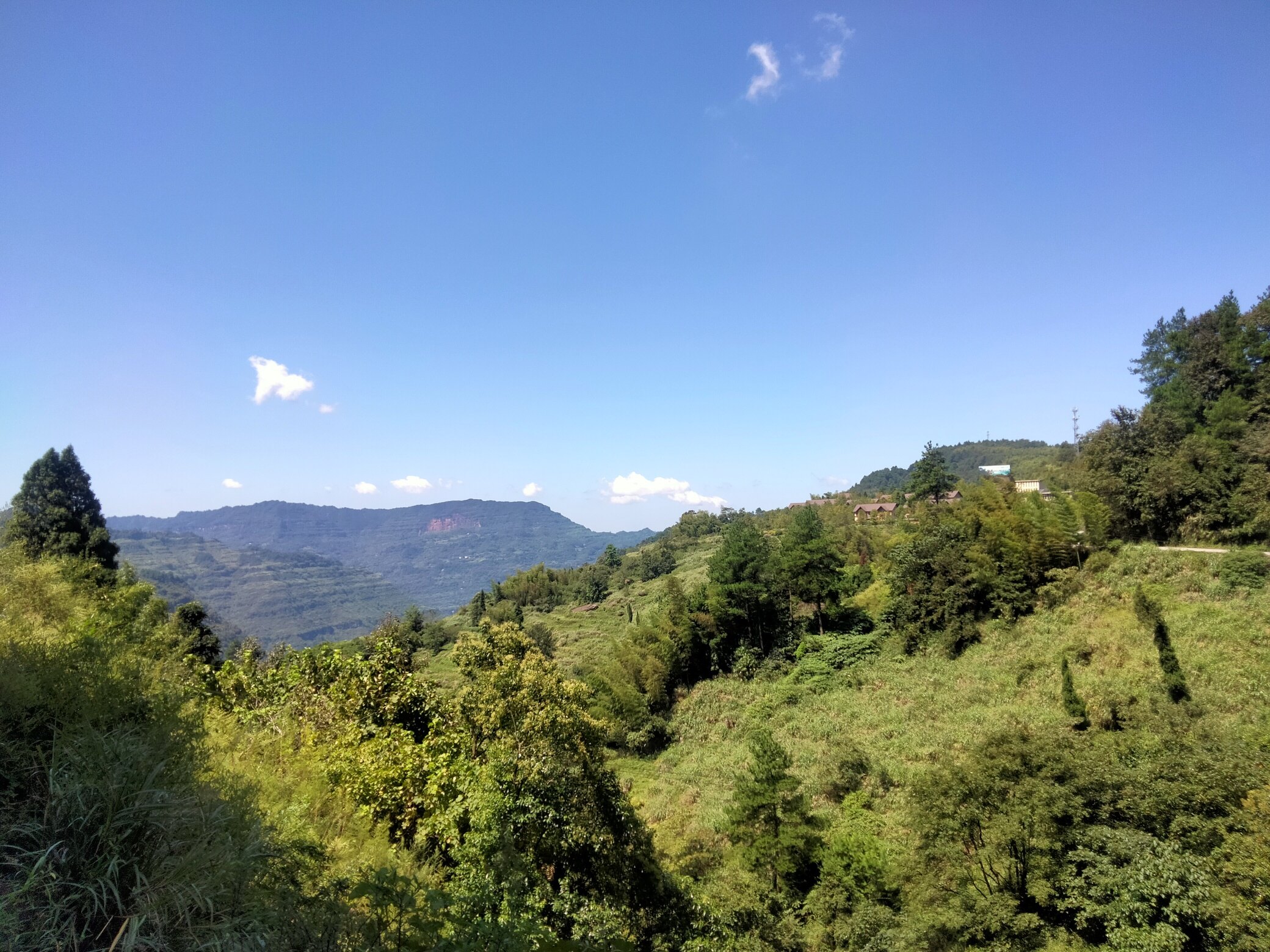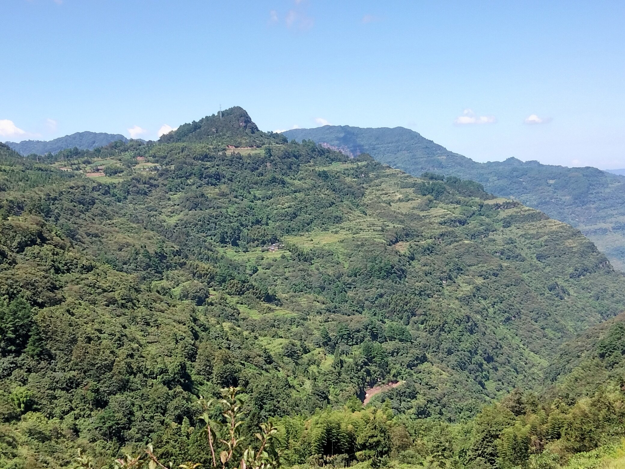 △△过文家坝上古剑山,一路上坡,坡度陡峭,低档位才能爬上去,大颗流汗,大声喘气 ,酣畅淋漓。抬头仰望,高高的山峰,矗立眼前,一条陡峭的山间公路向前延伸,时而向左,时而拐弯向右,很少有平整的路面供休息。沿途树木浓密繁茂,即使艳阳高照,公路仍是一片阴凉,加之阵阵山风,惬意三会行!一步又一步,一坡又一坡,每上一个台阶,对面的山峰就矮一段,站在公路边俯身下望,身后的公路一次次的被抛下谷底,满满的成就感,征服的魅力激励着骑行车不断超越!