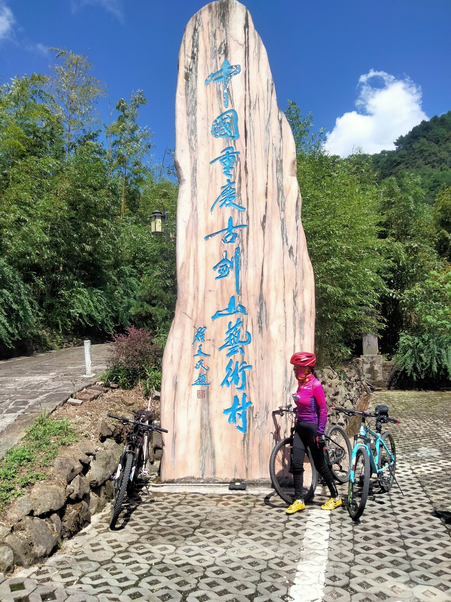 △△古剑山环山大道,仿佛缠绕在山间的腰带,炒油路面,双向两车道,骑行舒畅,即使小陡坡也无法阻挡我们征服的热情。翻过一座山头又一座山头 ,艺术村终于现身。在村牌下打卡留影,又向净音寺驶去,五公里的路程,弹指一挥间。