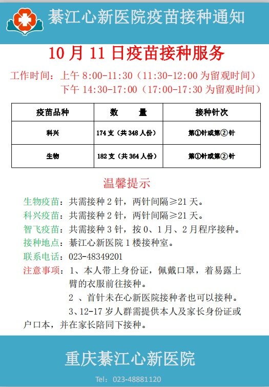 10月11日心新医院疫苗接种服务通知
