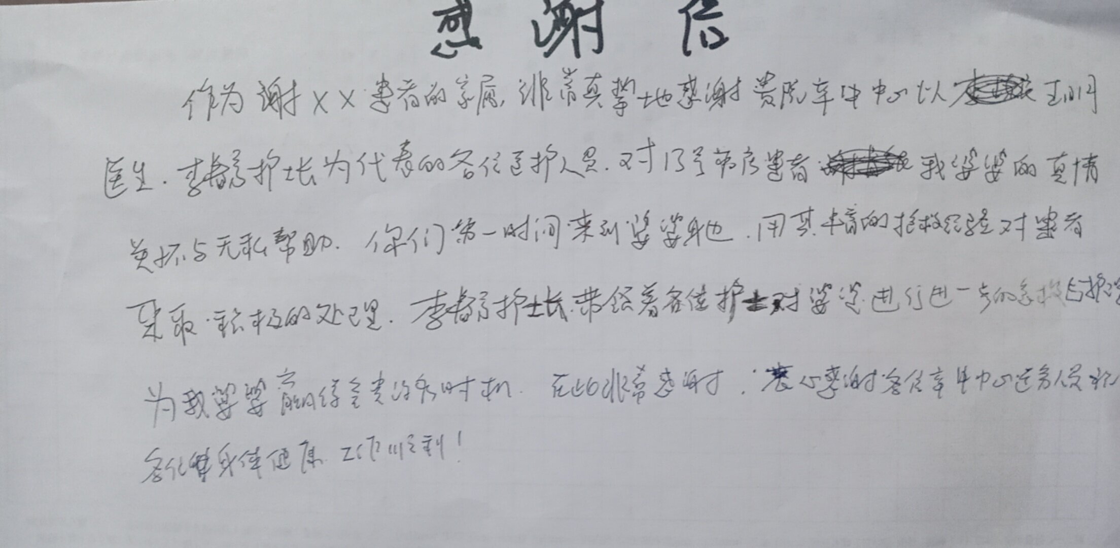 作为谢XX患者的家属,非常真挚地感谢綦江区人民医院卒中中心以王明医生、李春秀护士长为代表的各位医护人员,对13号病房患者,我婆婆的真情关怀与无私帮助。你们第一时间来到婆婆身边,用丰富的抢救经验对患者采取积极的处理。李春秀护士长带领着各位护士对婆婆进行进一步的急救与护理为我婆婆赢得宝贵的时机。在此非常感谢:衷心感谢各位卒中中心医务人员,祝各位身体健康,工作顺利!