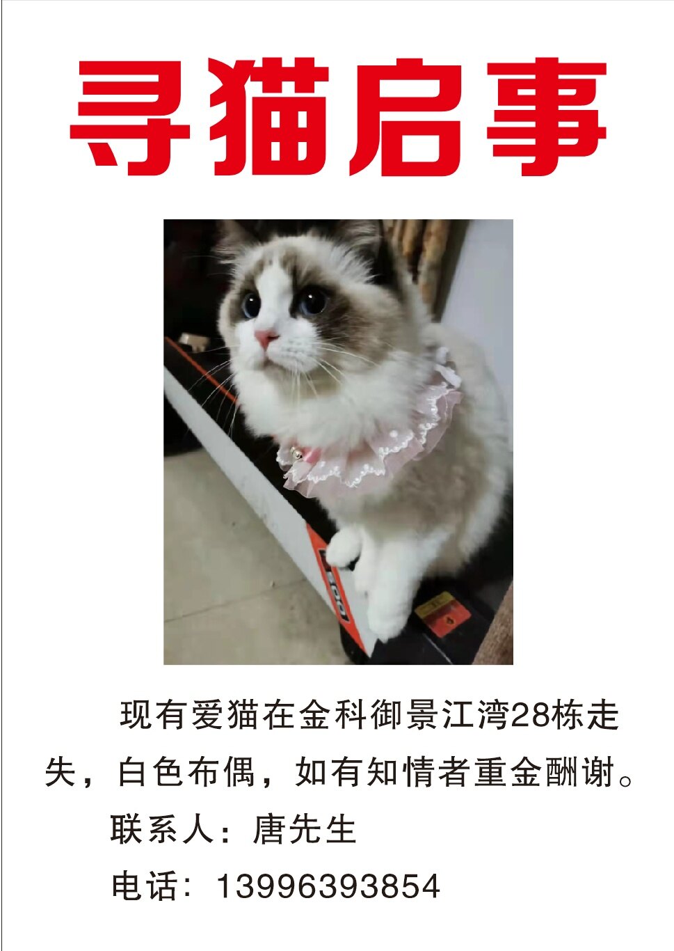 于10月30日上午5点左右,跑出去了,地址在御景江湾附近,上午有人在电力街附近见过,如有知情者请速与我联系,重金酬谢,,看到就请抓住然后与我联系,13996393854