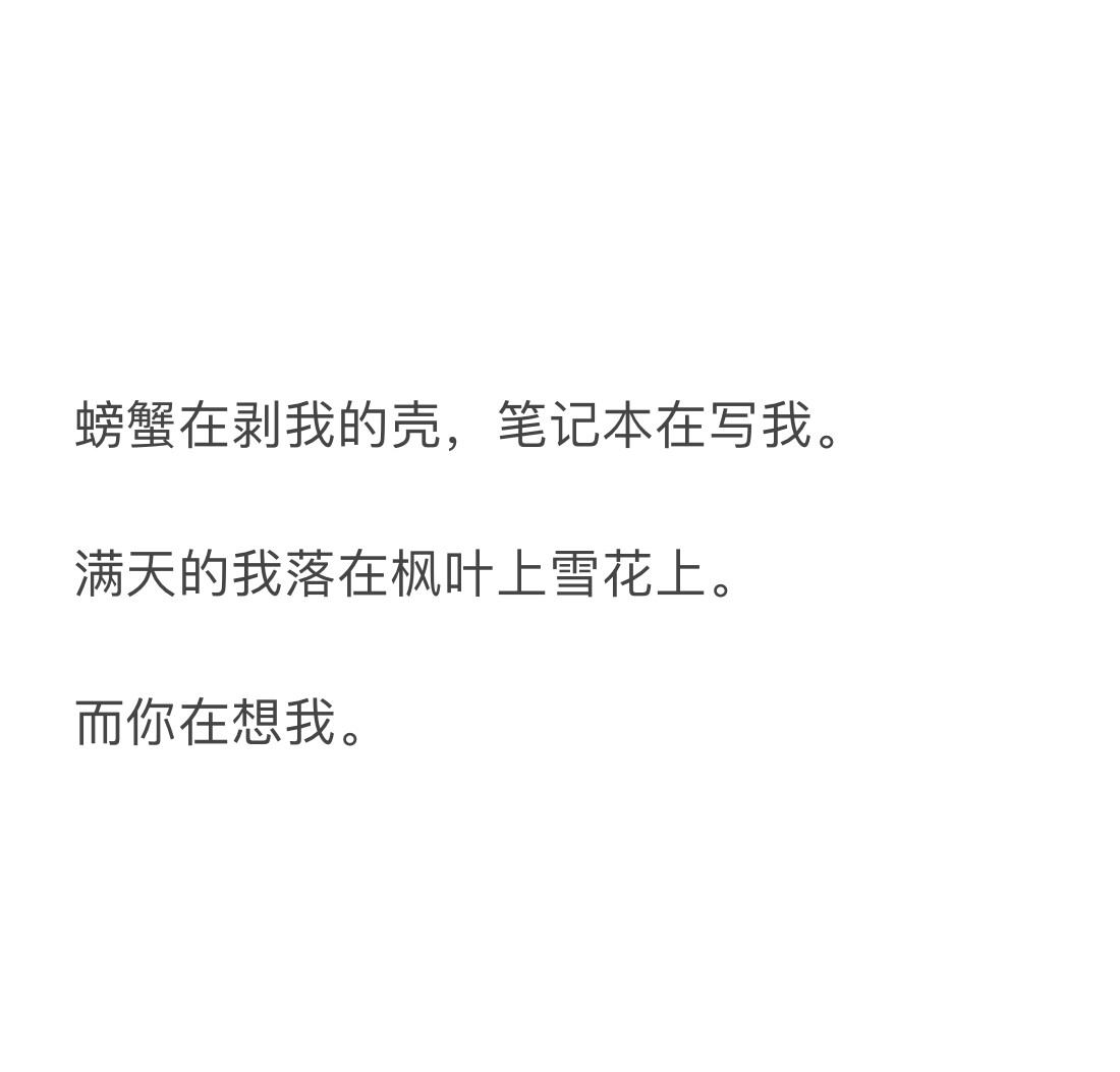 只有世界颠倒你才会爱上我,还可以全部反过来读,我剥螃蟹壳,我写笔记本,漫天的雪花和枫叶落在我身上,我在想你。这是典型的单相思 ,表达出了作者对现实状况的无奈。这些都是不可能的,螃蟹不可能剥我的壳,笔记本不可能写我,我不可能落在枫叶和雪花上,你不可能想我。