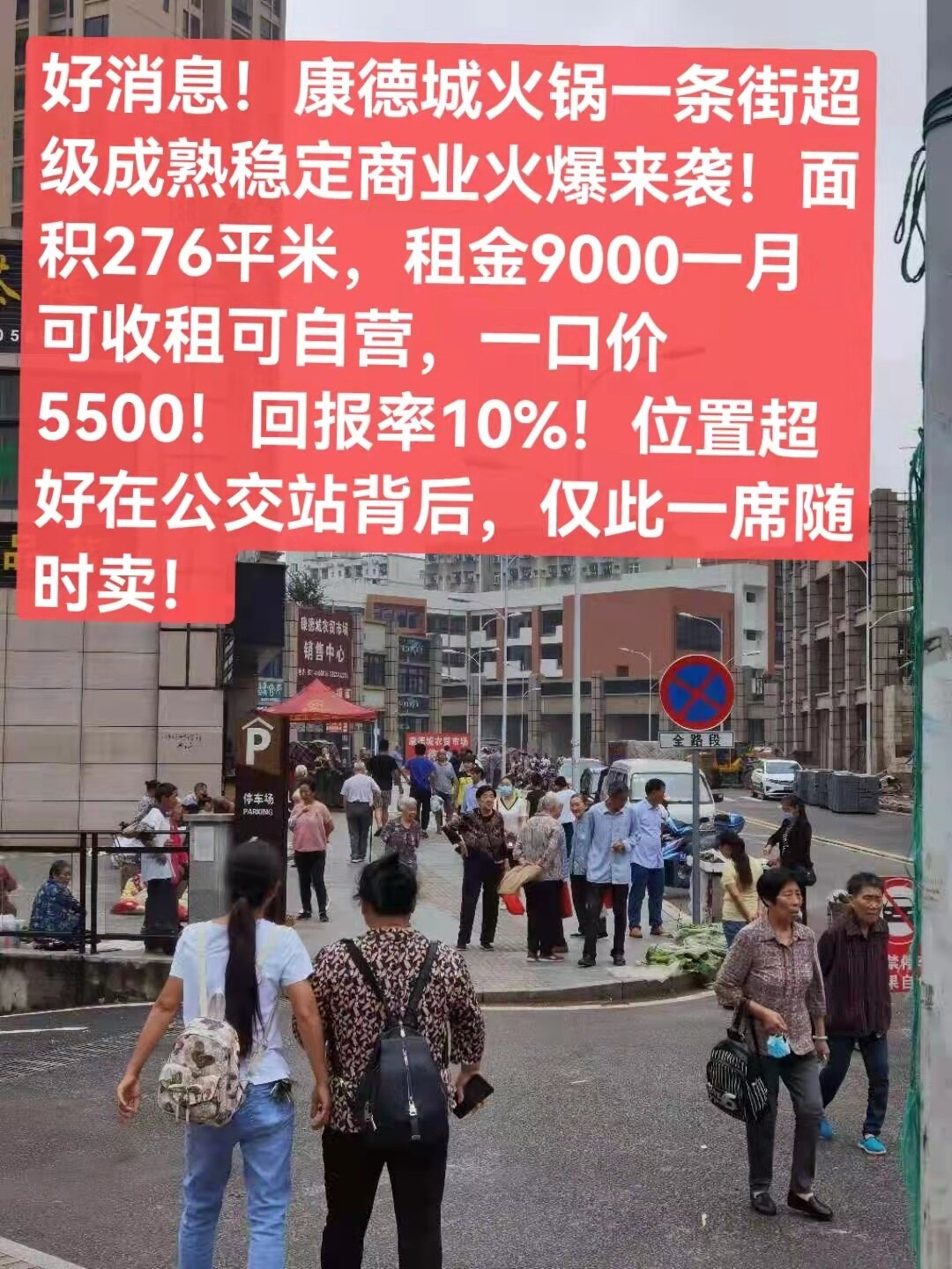 好消息!康德城火锅一条街超级成熟稳定商业火爆来袭!面积276平米,租金9000一月可收租可自营,一口价5500!回报率10%!位置超好在公交站背后,仅此一席随时卖!