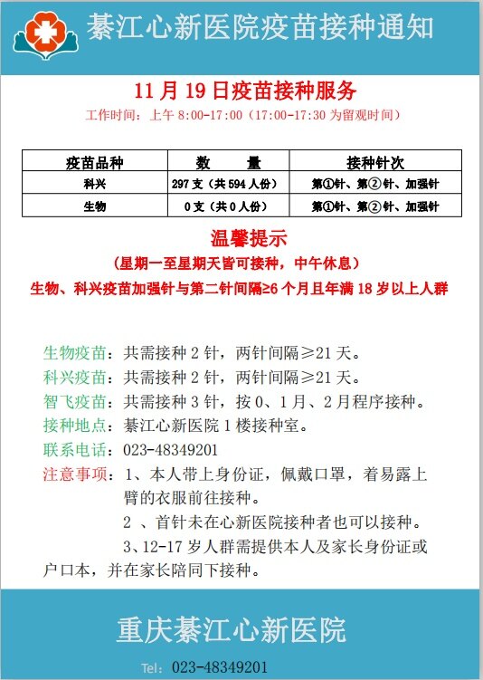 11月19日心新医院疫苗接种服务通知