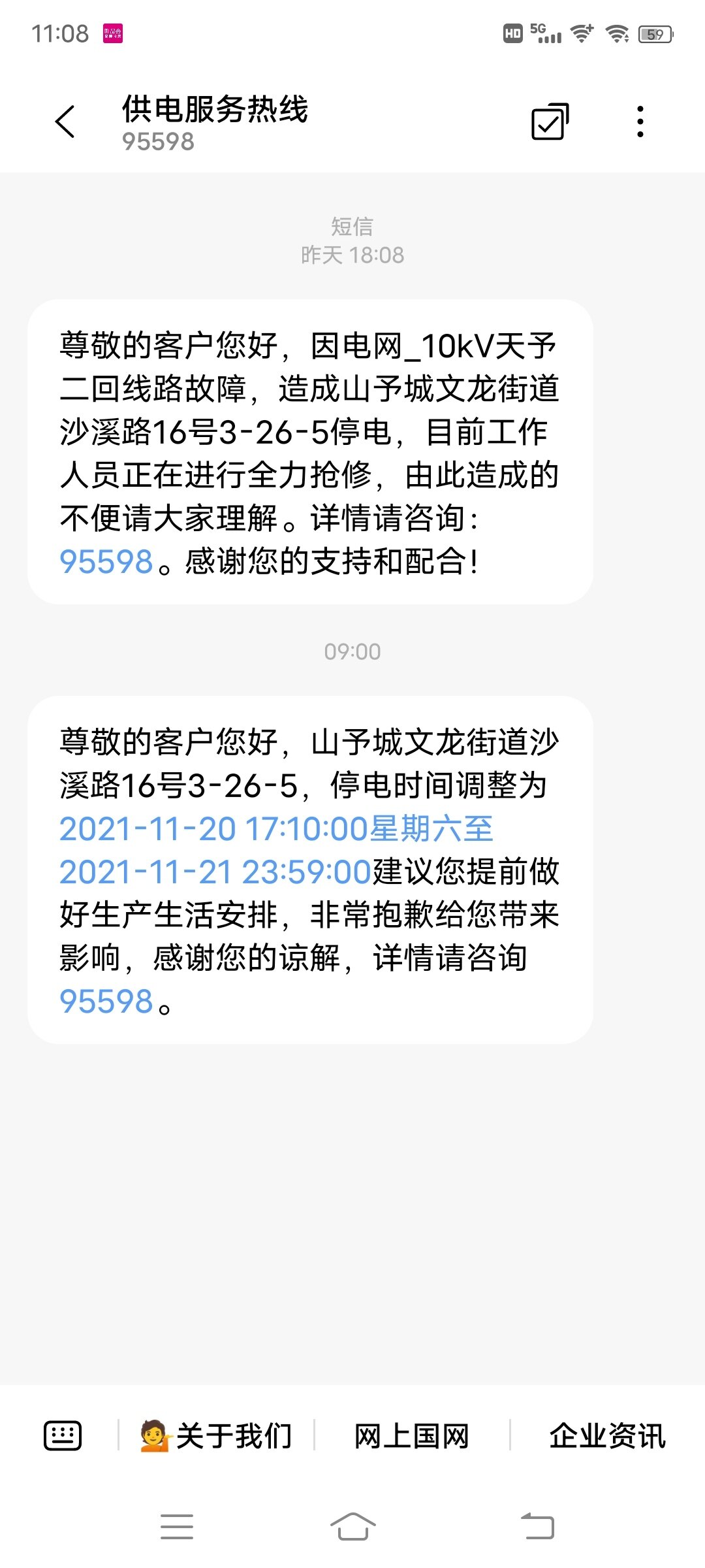 尊敬的客户您好,山予城文龙街道沙溪路16号3-26-5,停电时间调整为2021-11-20 17:10:00星期六至2021-11-21 23:59:00建议您提前做好生产生活安排,非常抱歉给您带来影响,感谢您的谅解,详情请咨询95598。