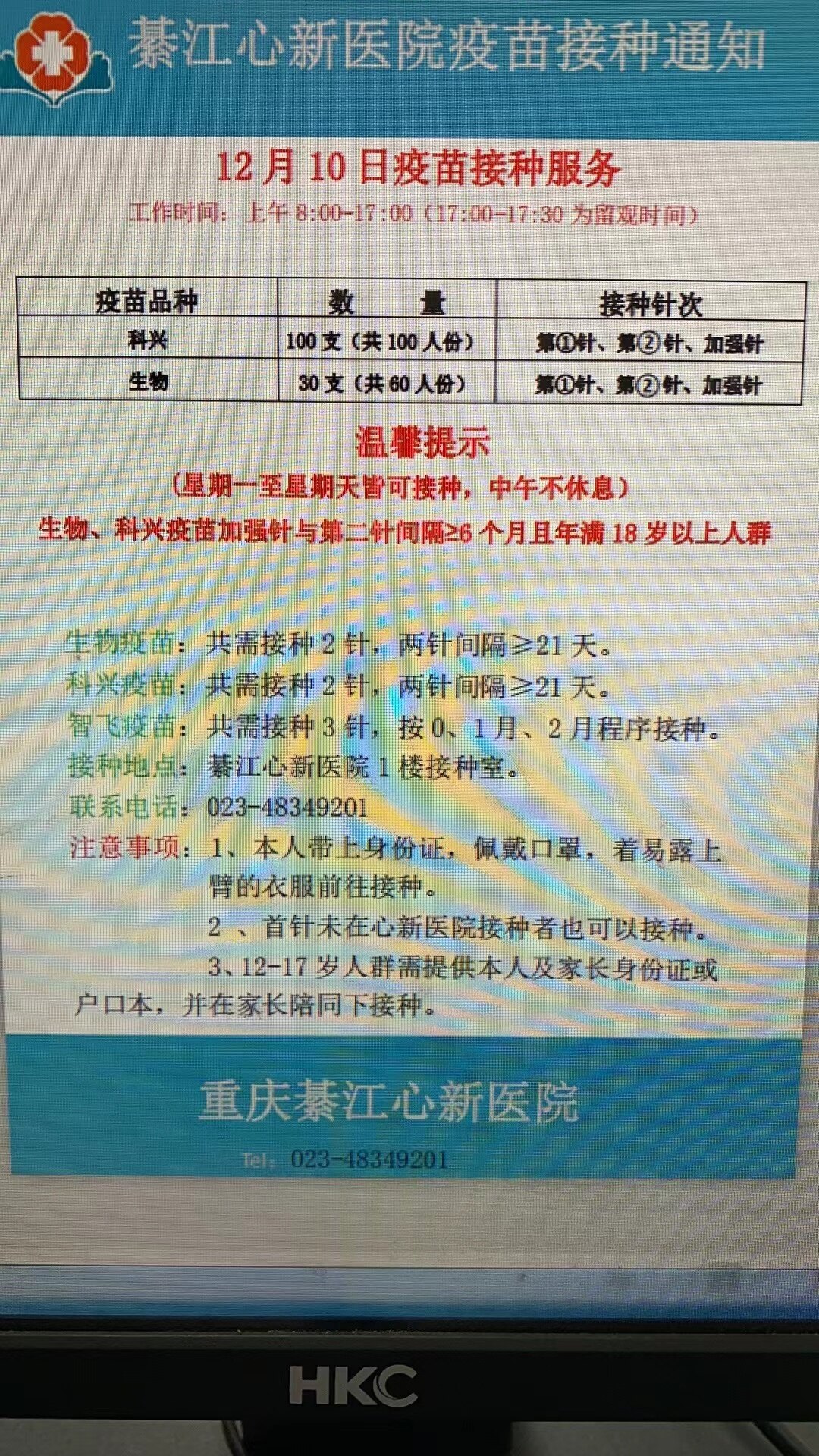 12月10日心新医院疫苗接种服务通知