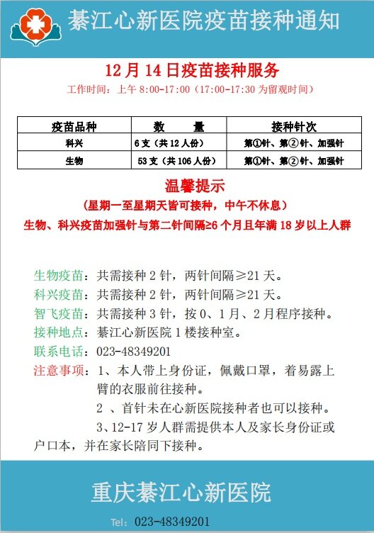 12月14日心新医院疫苗接种服务通知