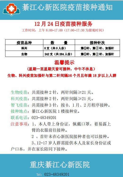 12月24日心新医院疫苗接种服务通知