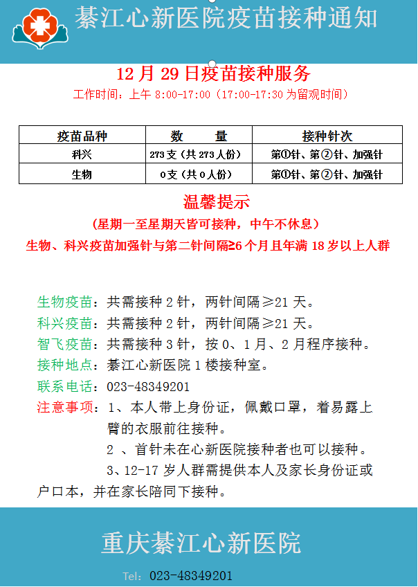 12月29日心新医院疫苗接种服务通知