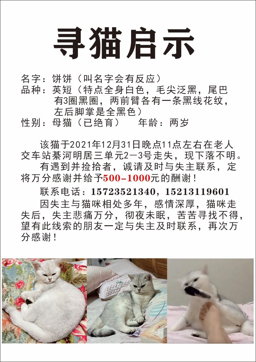 2021年12月31日晚 大概在23点左右,家里英短银渐层在下北街綦河明居小区走失!!现下落不明,家人已经连续寻找二十几个小时,还会持续寻找,猫咪意义重大!遇到捡拾者将给予500-1000元的感谢费!!望大家帮忙转发扩散!!万分感谢