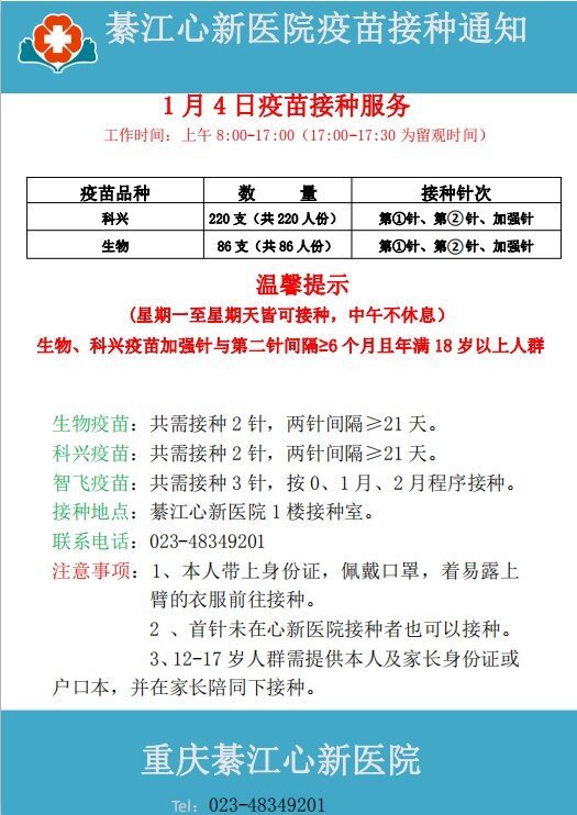 2022年1月4日心新医院疫苗接种服务通知