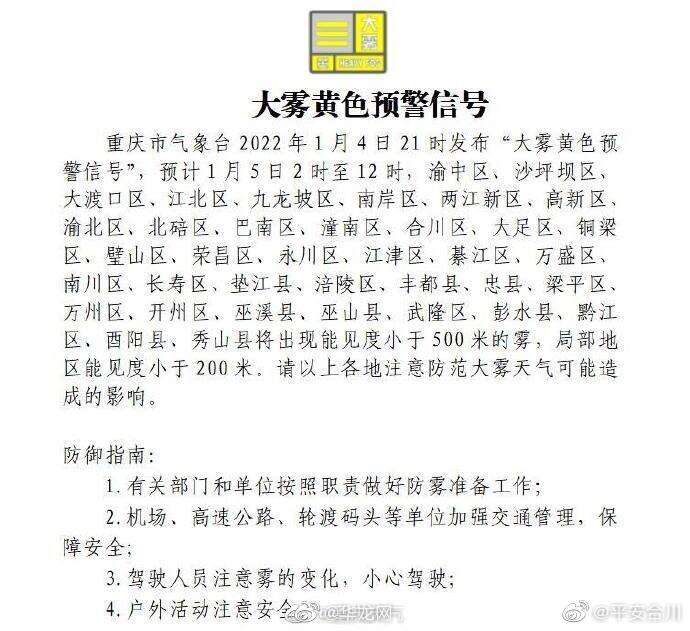 【重庆气象台发布大雾黄色预警信号】
