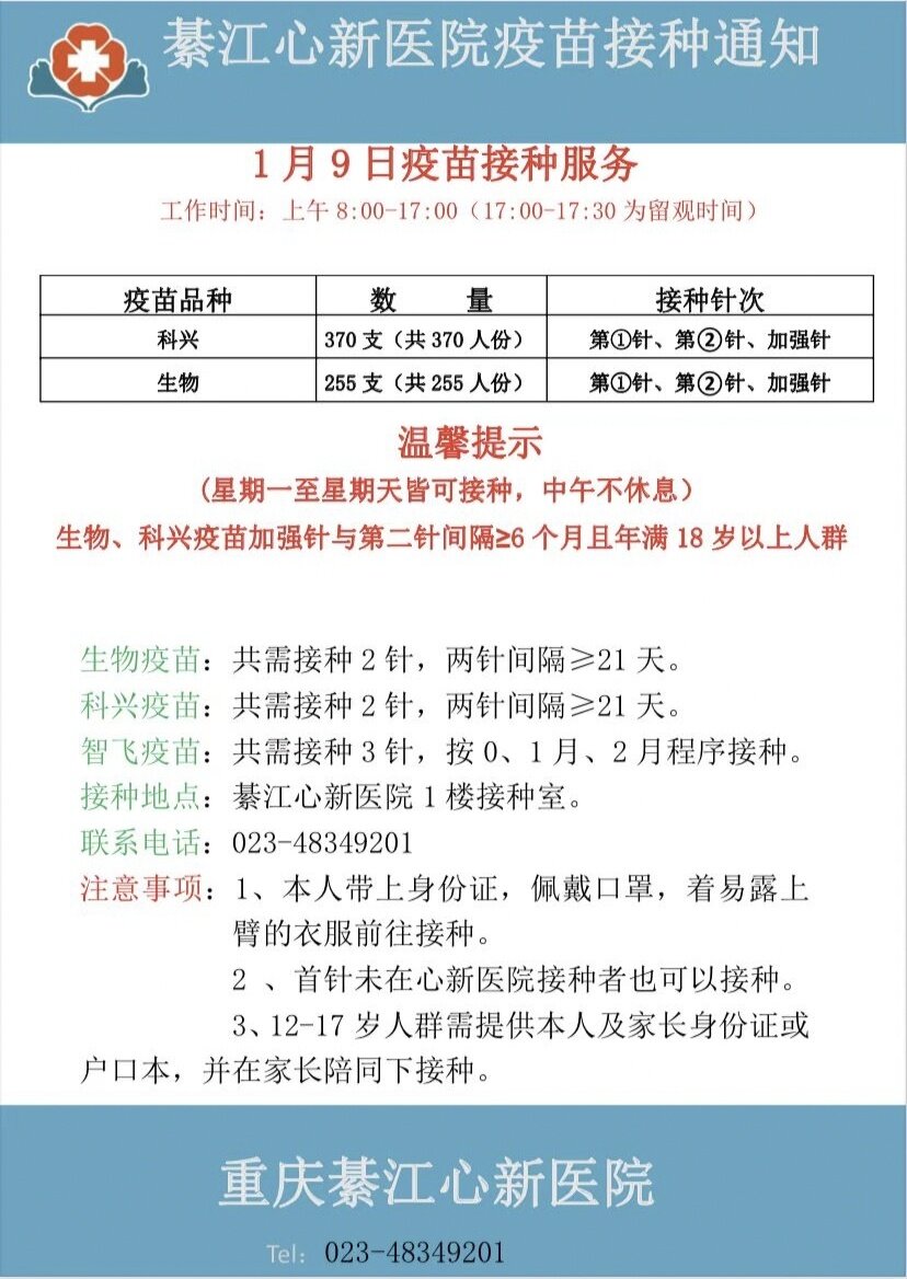 2022年1月 9日心新医院疫苗接种服务通知