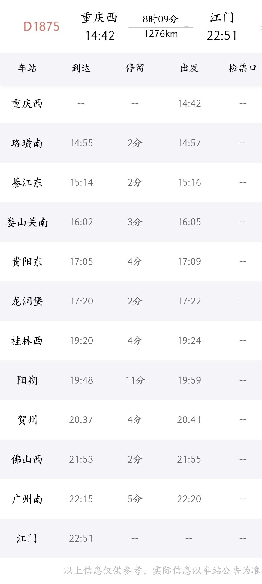 1月17日起,重庆西-广州南D1875次延长至江门终到,具体列车开行信息以车站公告为准。