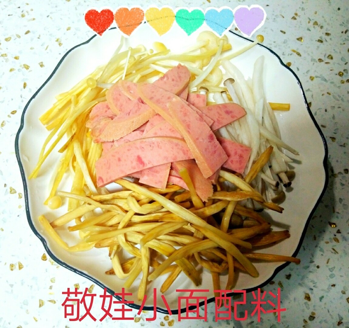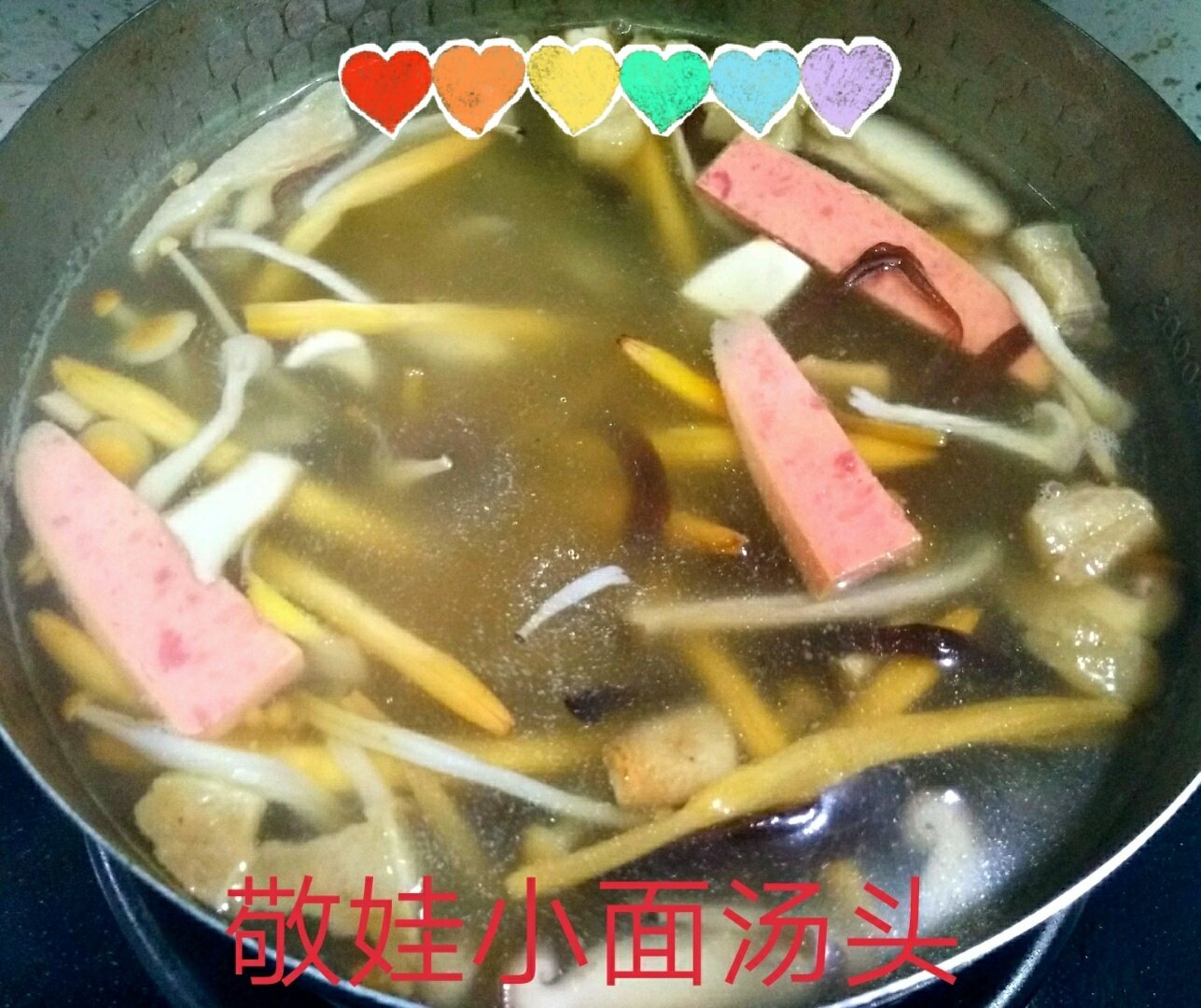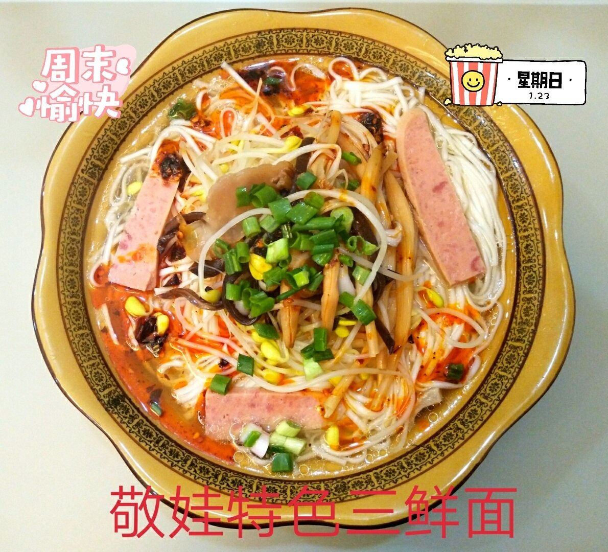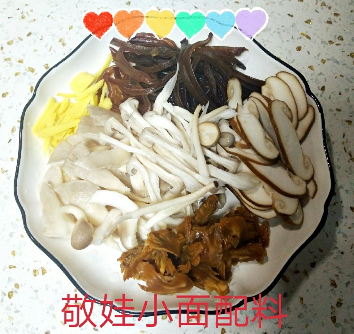 做面犹如做人。认真调配的各种配料(六种菇和菌、鲜木耳、老姜丝、妈妈做的老菜、豆芽、火腿肠、黄花),按照松藻米线的做法,精心熬制的汤头,让敬娃的特色小面增色不少。那个味道鲜得霸道!想吃辣椒就放点敬娃油辣子,洒上几颗火葱头,配上一碟跳水青菜头。美味简直美呆了,感觉人生已经到达了巅峰