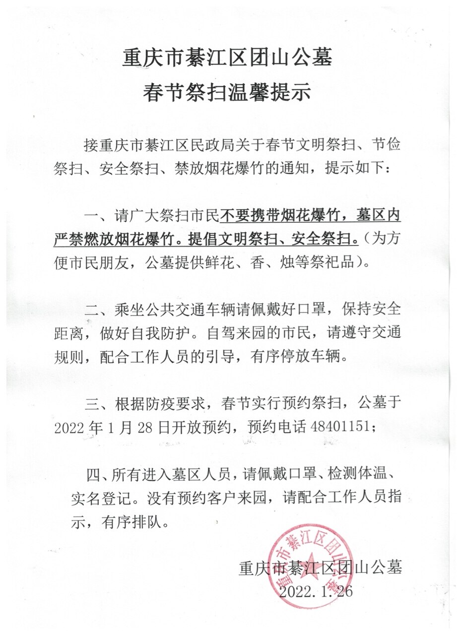 重庆市綦江区团山公墓春节祭扫温馨提示