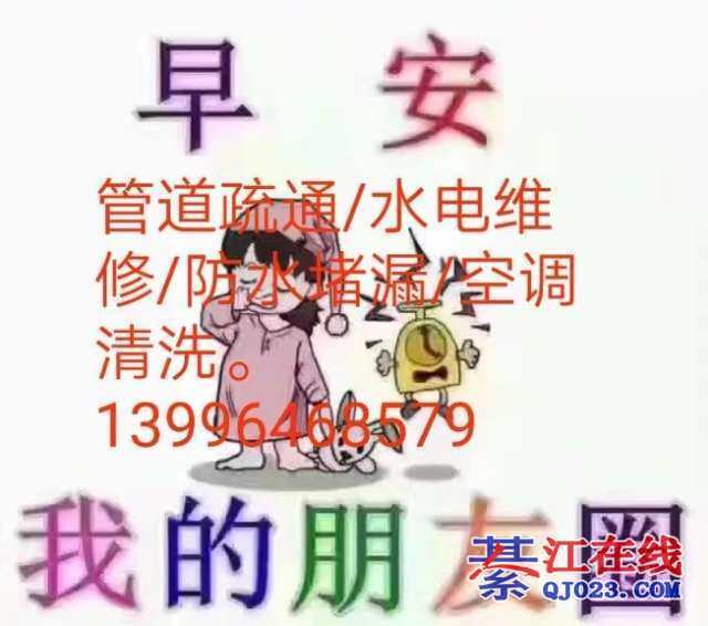 綦江全城各乡镇《疏通管道》,室内外各种管道改造,水龙头高压管维修及安装,菜盆混水阀维修及安装,等等各种给水管或下水管道维修及安装,外墙陆水管维修及安装,水箱马桶维修及安装,进水阀或出水阀维修及安装,开关插座维修及安装,便槽更换,油烟机清洗,空调清洗,门面拆除,“专清掏化粪池清理”。专修楼层漏水防水堵漏,厨房厕所漏水堵漏,等等各种业务工程。电话:13996468579