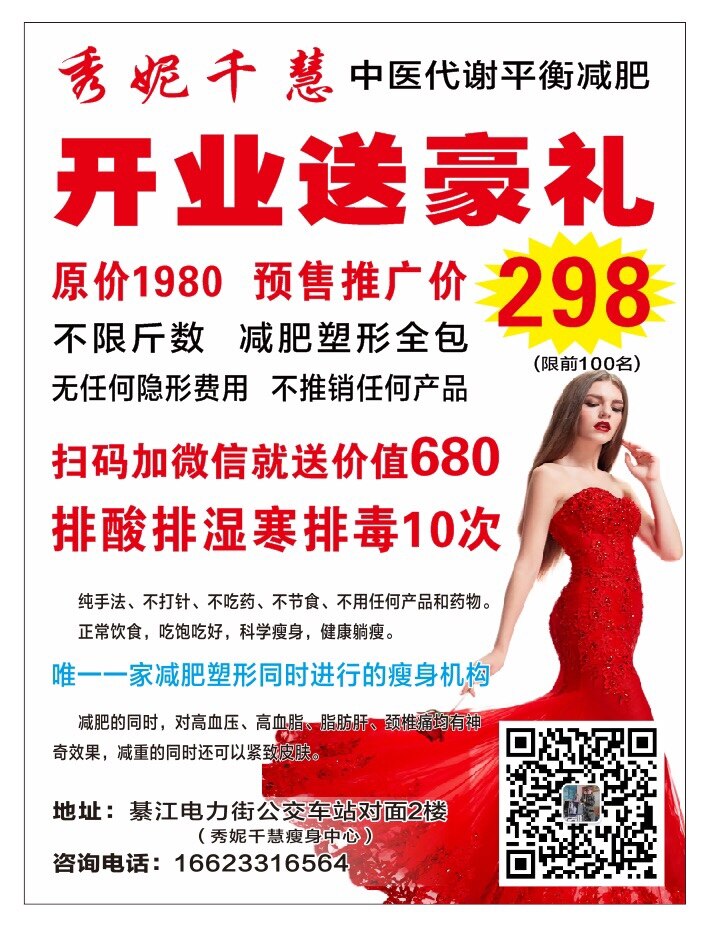 姐妹们,你们别担心,298三年,想瘦多少瘦多少,减肥塑型一起298,中途绝对没有任何隐形性消费,不推销任何产品[抱拳]限开业前100名,抢完恢复原价。