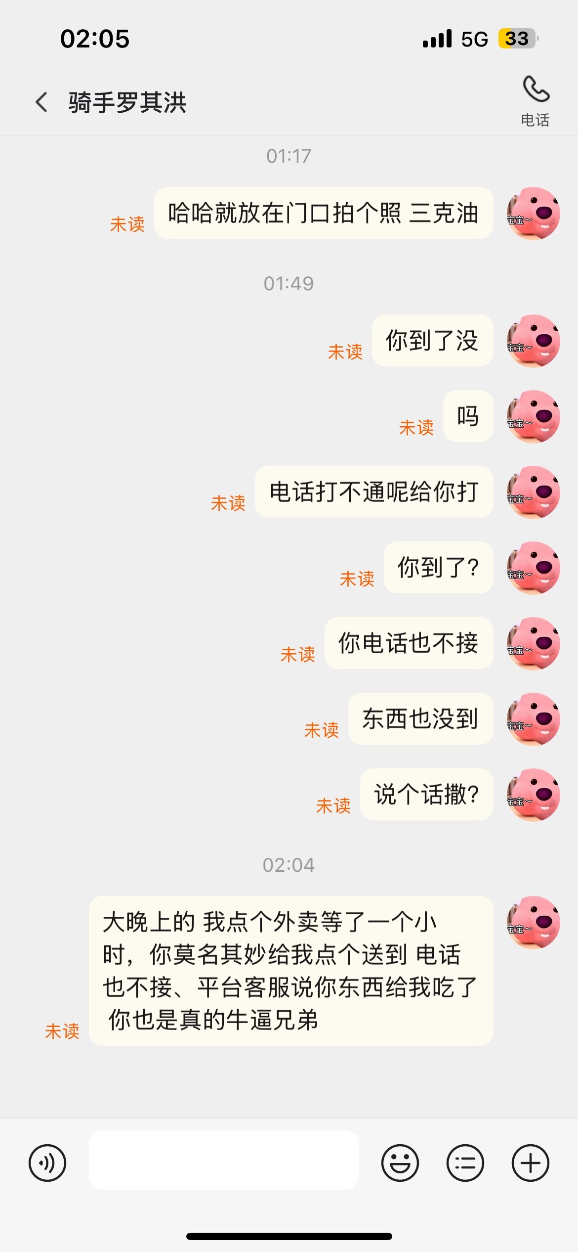 骑手还是送来了的啊,但是嘴里骂骂咧咧的啊,喊我娃儿不要再拼了,他送这一单都是亏的,什么什么的。所以娃儿说再也不喊外卖了。