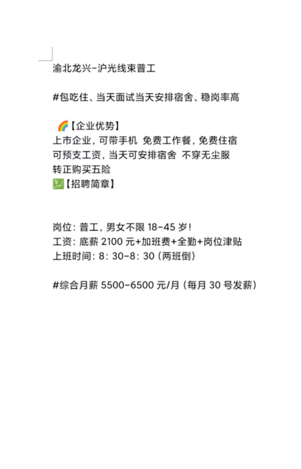 !而且工价也不是很高,是什么工价加在职补贴这样套着的,目前还是短期工只需要十几天的工期,而且还要被吃二头,时间做13个小时的产量到手可能只有11个小时的工钱,主要还是很多都是之前劳务被放了的,有句话说,好马不吃回头草,这可能在,吃饭面前真的很难选择!又转不了正,永远都是打游击队一样,这里做几天,又换地方,这样感觉很累,耽误的时间又多,我们正式工工资也不是很高,但是在周边也不是很低,忙的时候,女娃儿都可以拿一万多,不忙的时候五天八小时双休工作制也能拿四千多,五险一金都有,而且长白班,工作性质能很自由,可以随便玩,随便走,就连你随便多久去上班都可以,而且时间有时候很短,早上7点去,下午2点就回家睡觉了