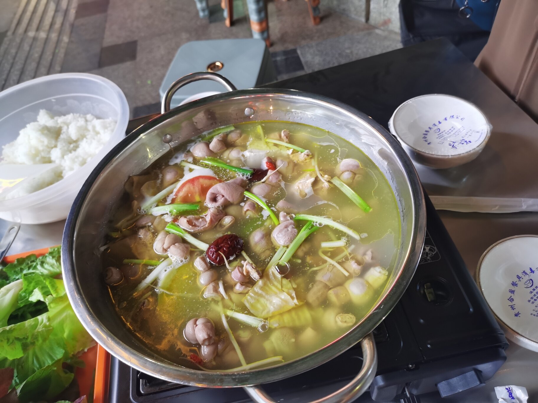 跟砂锅酸辣烫一样的,烫菜吃的火锅,用鸡和小肠炖的锅底,属于便宜实惠的。