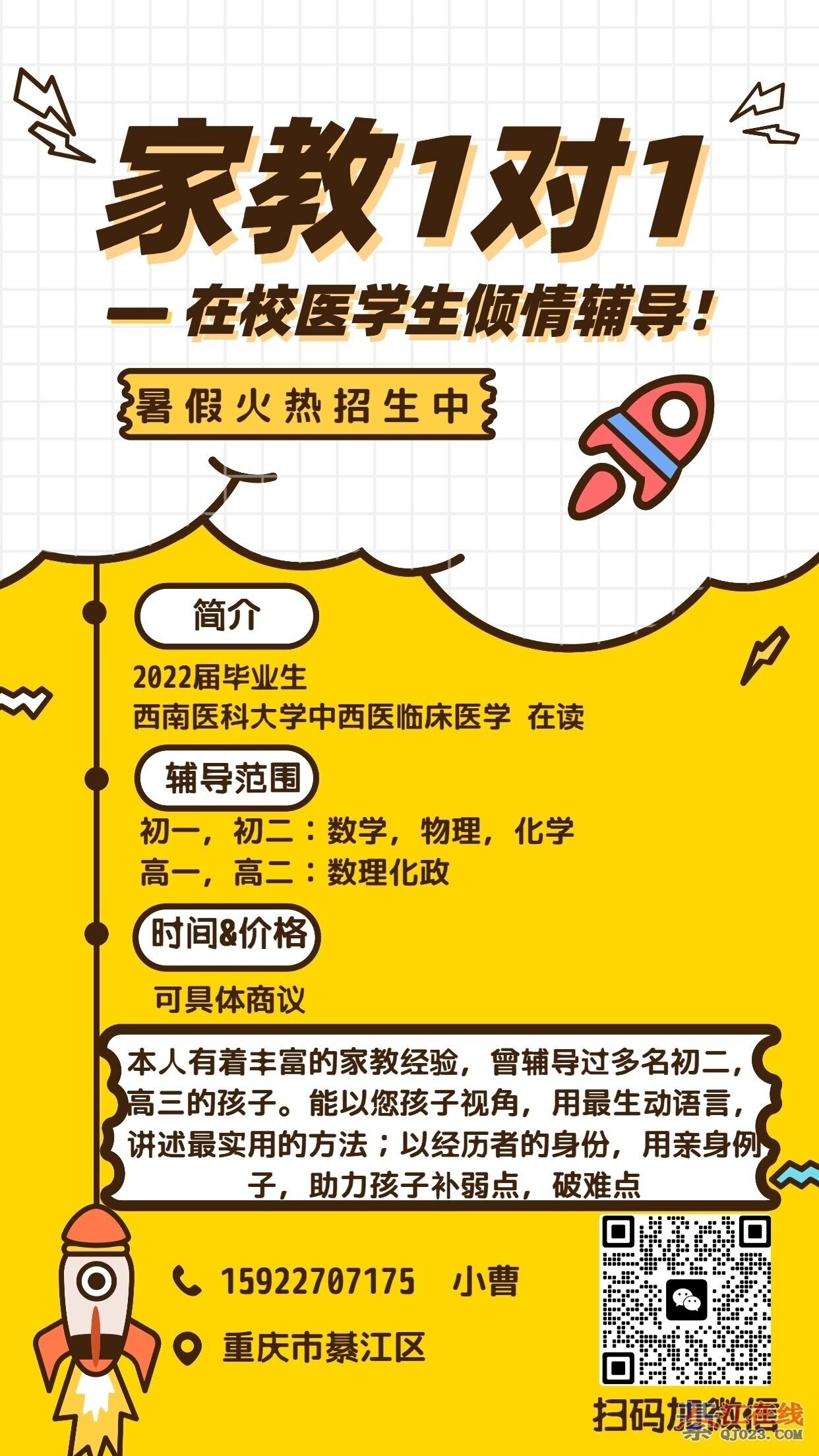 这个暑假,我将用医学生的严谨逻辑和获奖学霸的高效方法,助您的孩子学业跃升!时间灵活,价格优惠(比辅导机构便宜一半以上,效果不打折扣),可免费试讲。提分,我们是认真的!