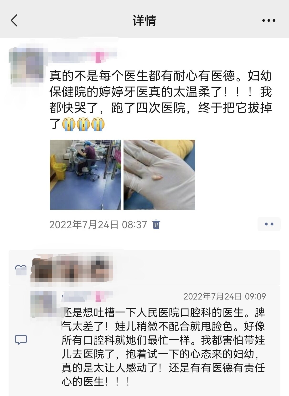 三年前娃儿拔多生牙就已经体验过了,再也不会去他们口腔科看牙齿了。她们那个打麻药的针,针管粗,针头长,灯照到娃儿,娃儿怕很正常啊。就稍微没配合她,直接就把东西甩到旁边架子上。凶得很。第二天想的是换个医生好一点,结果一副样子。最后去的妇幼,别个医生温柔的很,哄两句,娃儿乖乖就拔了。