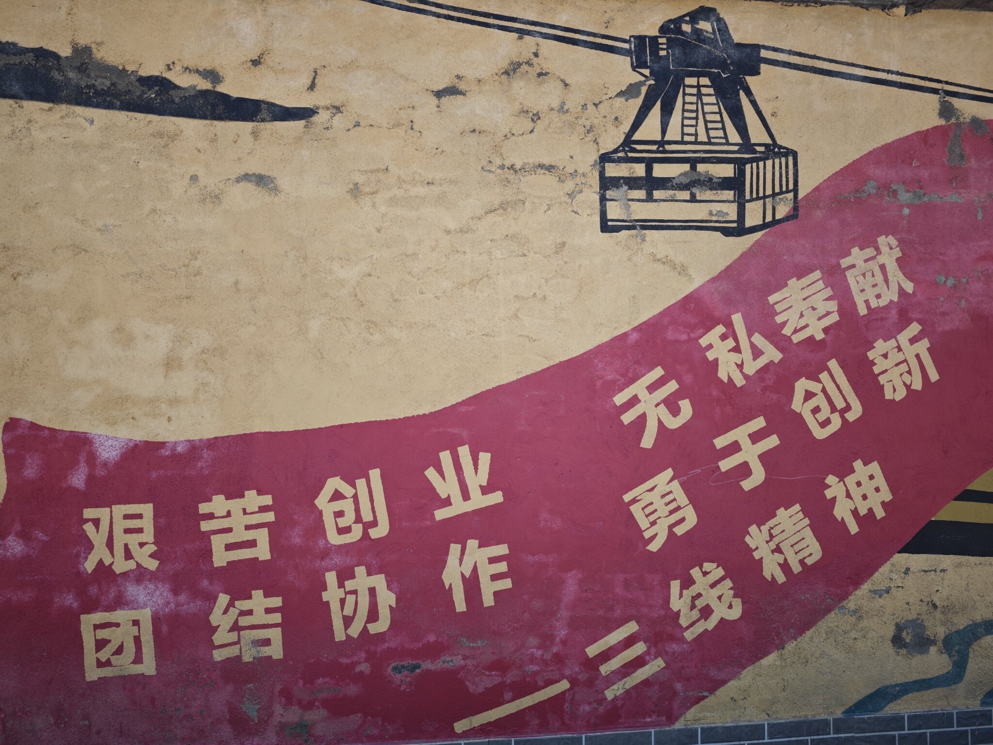 不是!这个一看就是是后面涂鸦的,几年前我路过是我看到的是小鱼坨铁矿附近老瓦片职工房子屋檐下土墙上的毛标!红白字体!泛旧了那是哪个时代遗留下来的东西,后来应该被粉刷了! 也就顶多5年左右!还有部分遗迹!